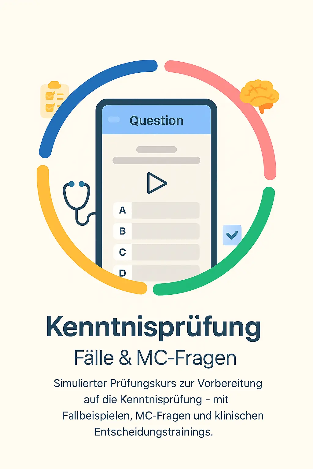 Simulierter Prüfungskurs zur Vorbereitung auf die Kenntnisprüfung – mit Fallbeispielen, MC-Fragen und klinischen Entscheidungstrainings.